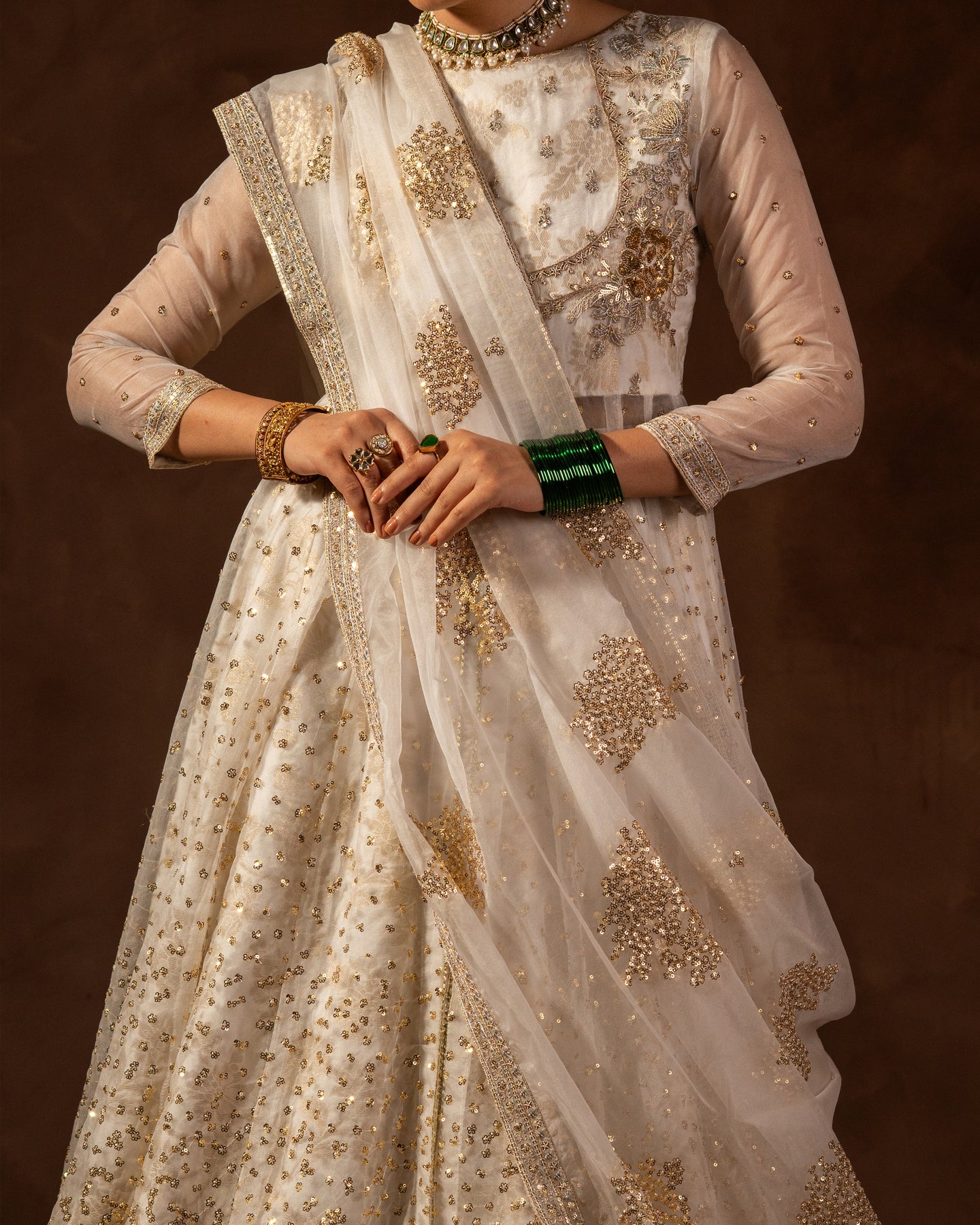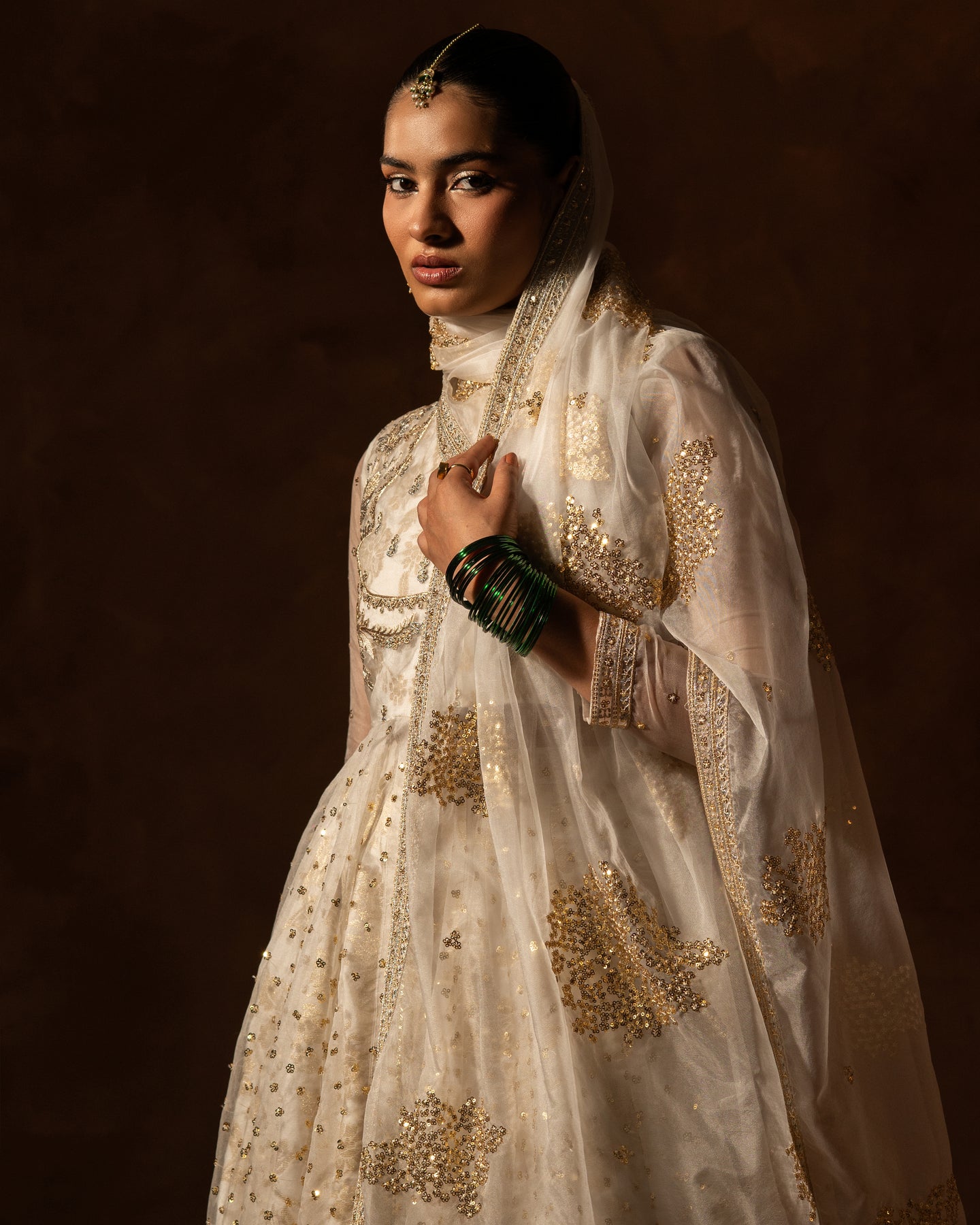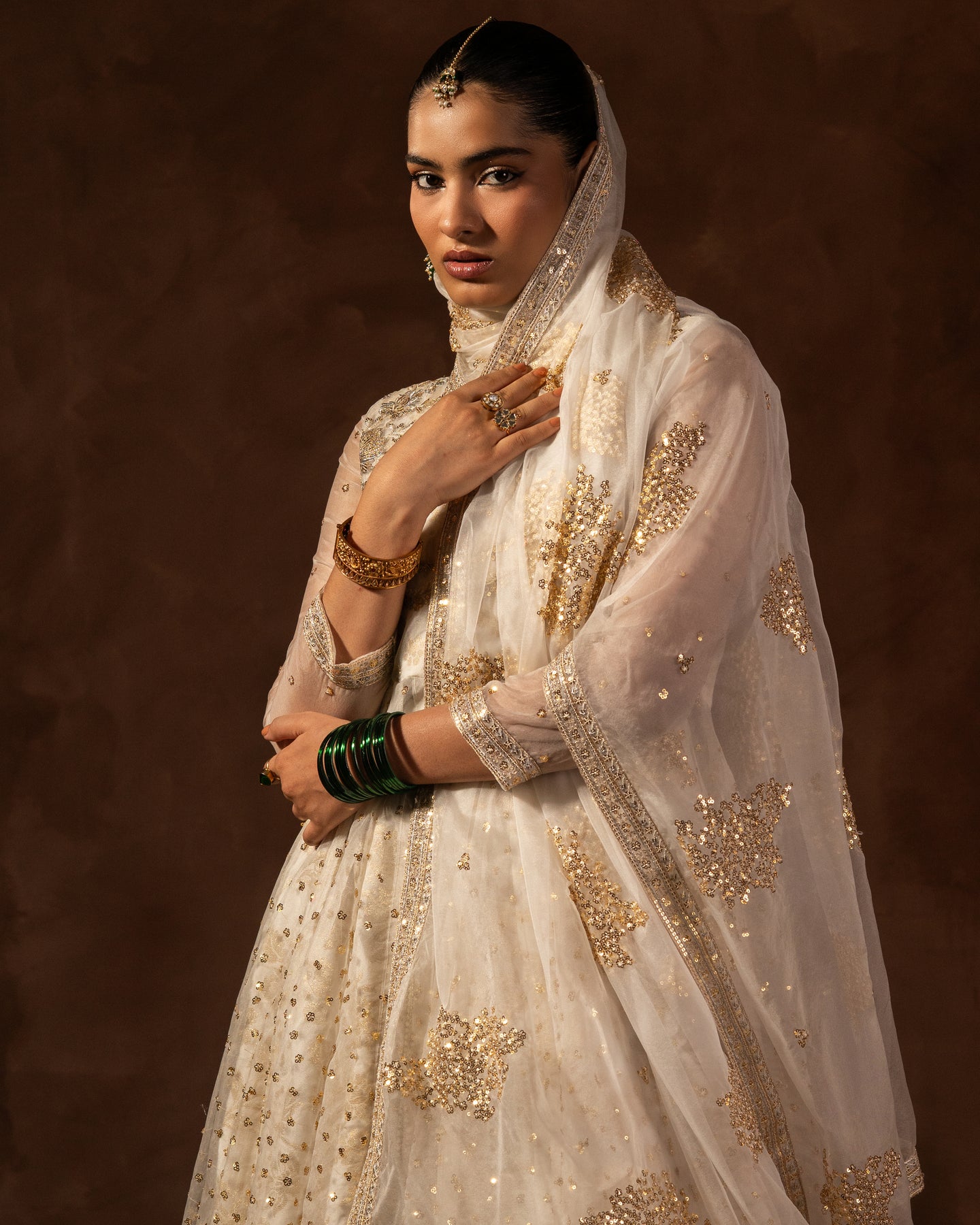 Mehrmah features a beautiful organza pishwas, an embroidered dupatta, and a pure cotton silk lehnga, all designed to make a statement at any wedding celebration. The pishwas is a work of art, with floral embroidery in golden sequin florals that bloom into a graceful ombré. The pishwas is finished with an ornate border along the panels and sleeves. A striking slit runs down the center of the pishwas, finished with a delicate gotta lace trim that allows for a beautiful movement when twirling. The matching organza dupatta mirrors the intricate embroidery, with a stunning border along all four sides and floral clusters scattered throughout. The brocade cotton silk lehnga completes the ensemble and comes with a basic built-in can-can underskirt. Features a fitted armhole.