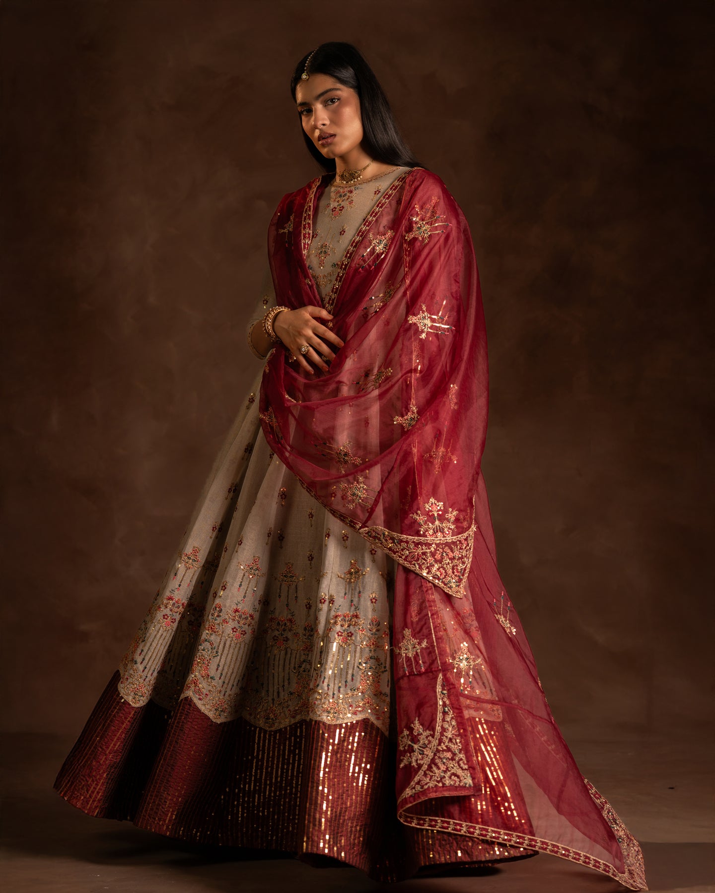 The outfit can be paired with a contrasting organza dupatta that features similar ethnic embellishments.