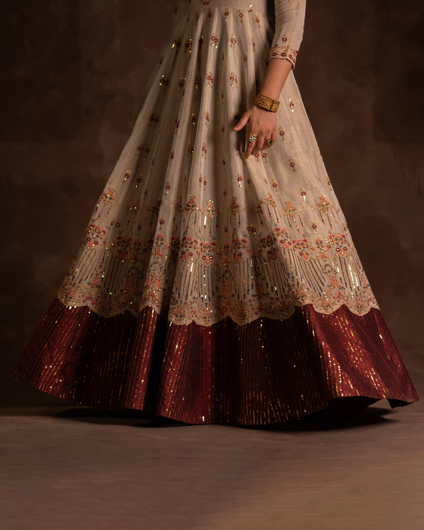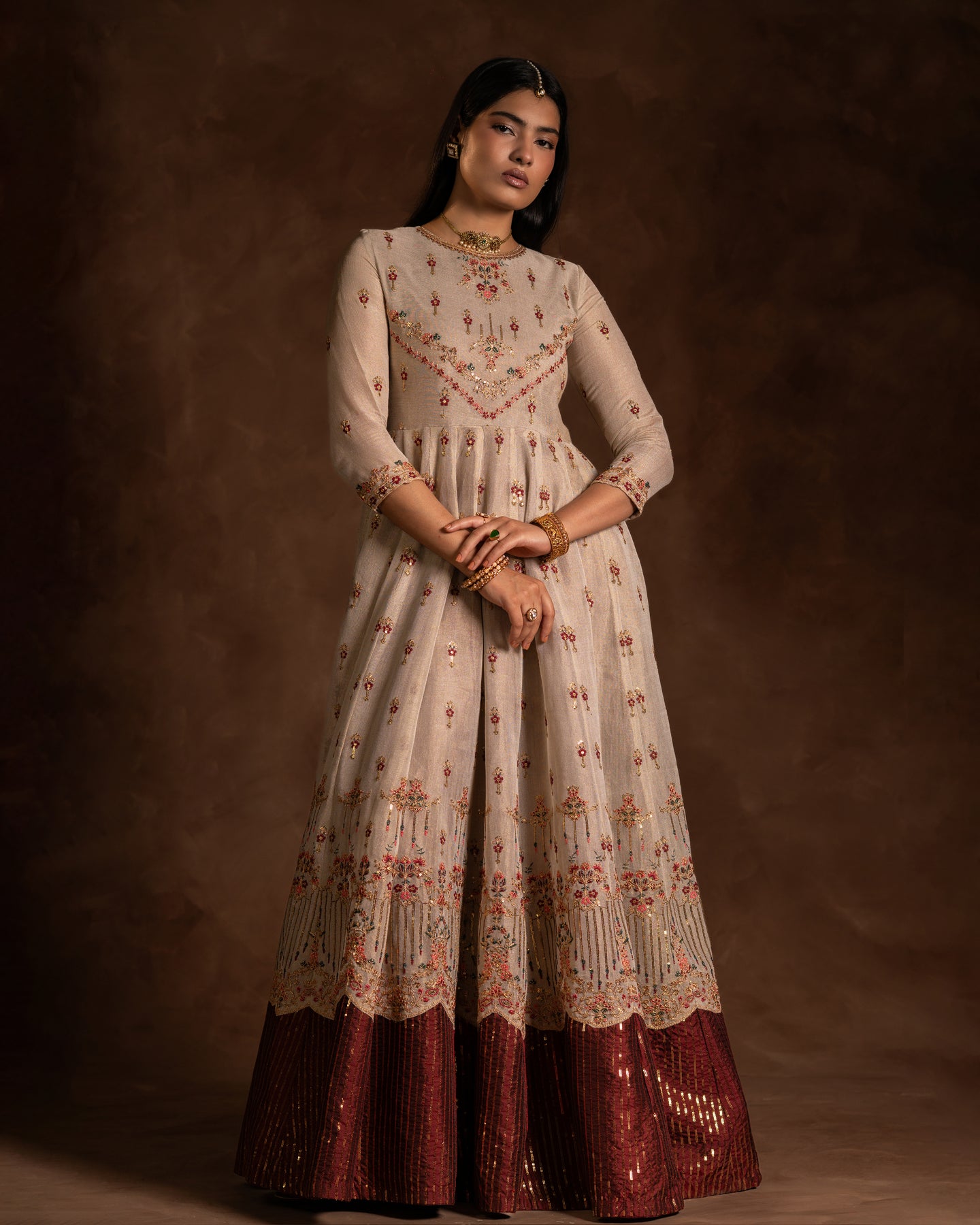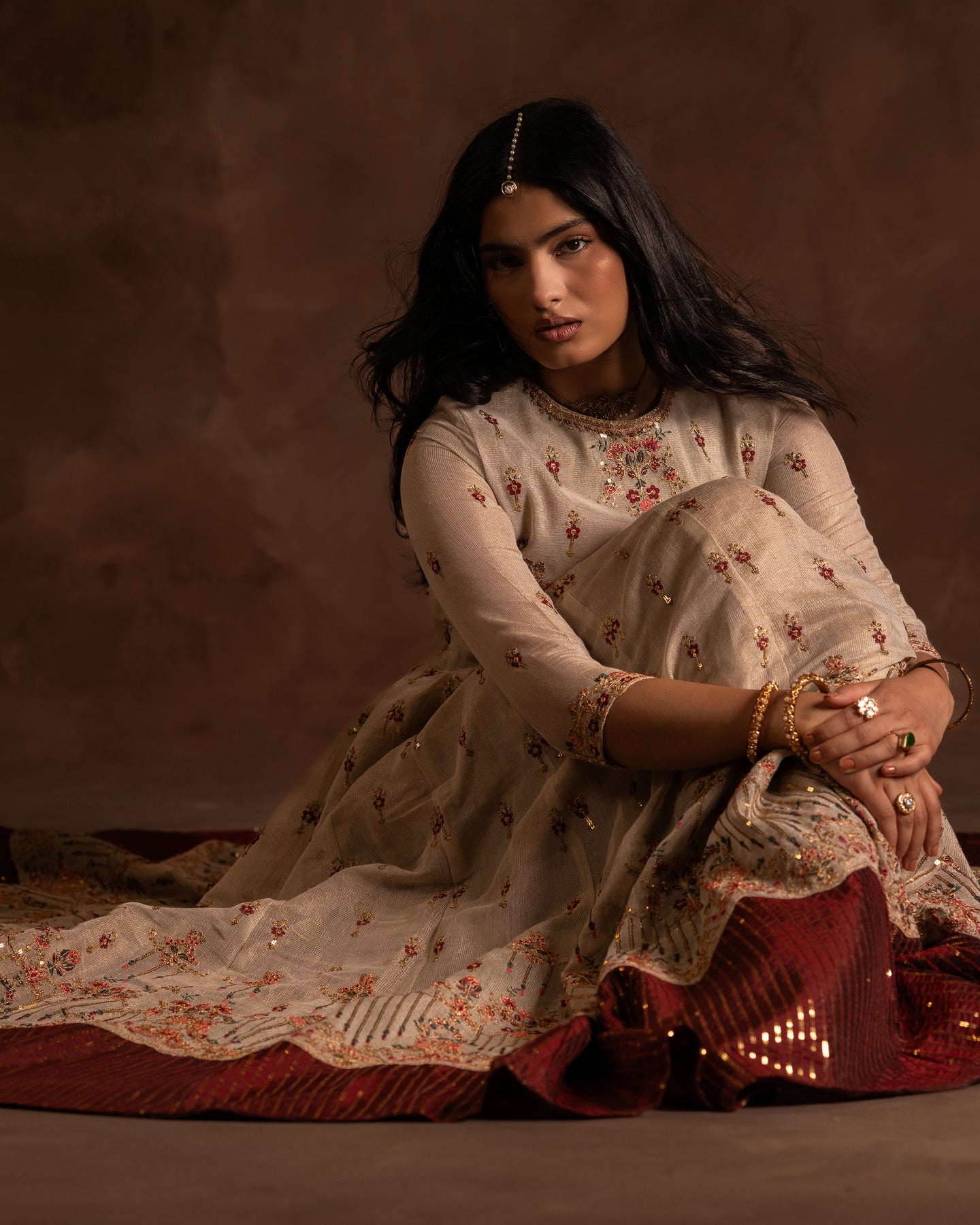Shamsa features a cotton net pishwas embroidered with ethnic floral embroidery motifs. The hem features a contrasting border that is enhanced with sequin embellishments. The pishwas is constructed with fitted sleeves.