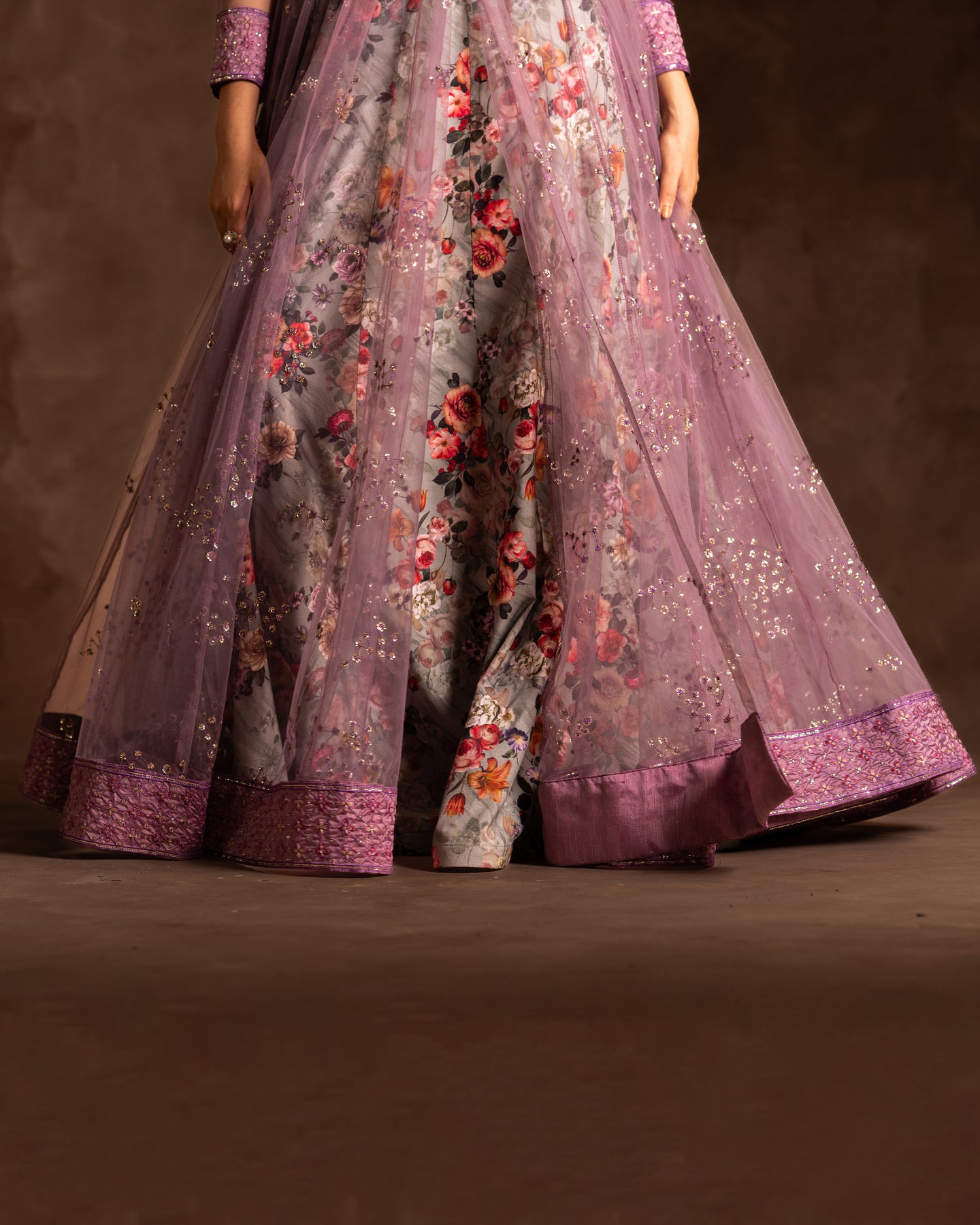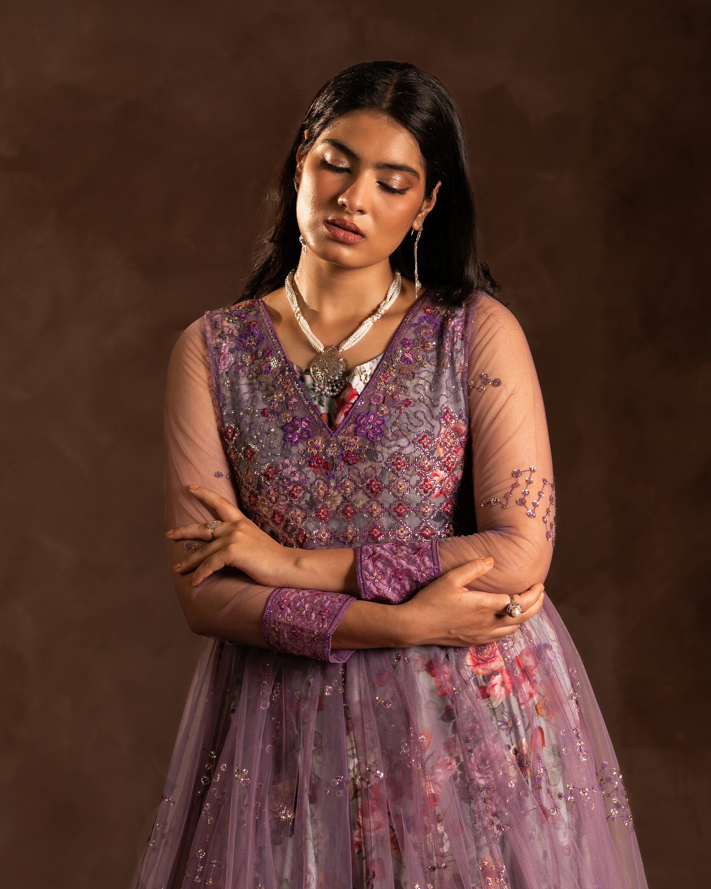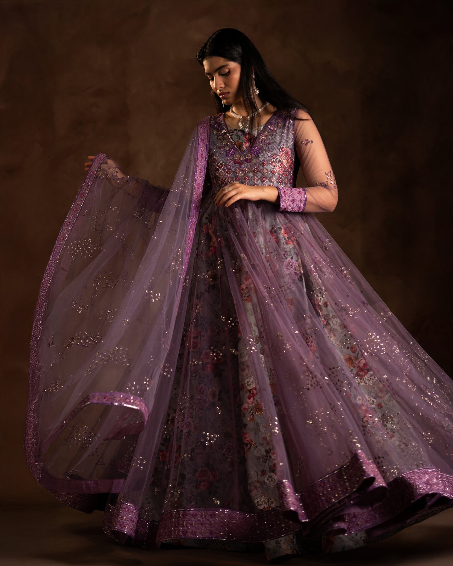 A luxurious 3-piece ensemble featuring a silk floral-printed pishwas. The outer kalidar layer is adorned with an all-over sequin spray and a beautifully embroidered bodice, finished with an embroidered silk border on the hem and sleeves. A coordinating embroidered dupatta completes the look.